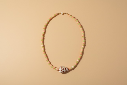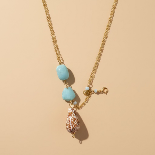 An elegant drop necklace featuring a gold-filled chain, snow quartz gemstones, and a handpicked cowrie shell with natural tiger spotting and soft purple hues. Measuring approximately 17 inches with a 2-inch extender, this piece is refined yet organic, with a subtle coastal presence.